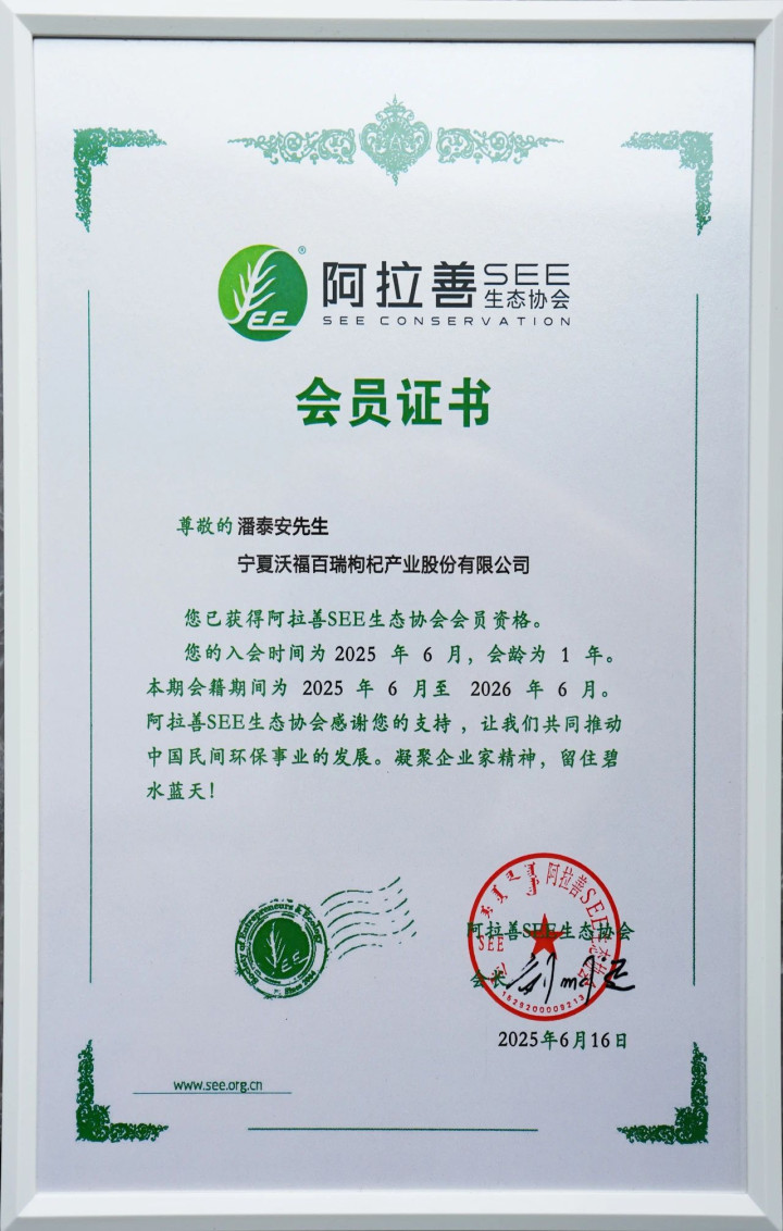 展望未来,沃福百瑞将以加入阿拉善SEE生态协会为新的起点,在协会的引领和赋能下,以更高的标准践行企业社会责任,充分发挥龙头企业的示范引领作用,推动枸杞产业链上下游协同发展,持续探索生态保护与产业繁荣的共赢模式,积极参与SEE的各项环保项目与倡议,留住碧水蓝天,为绘就人与自然和谐共生的塞上江南壮美画卷贡献沃福百瑞的力量。